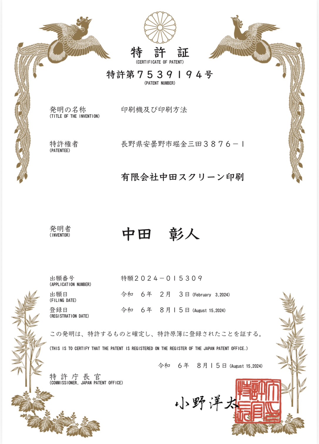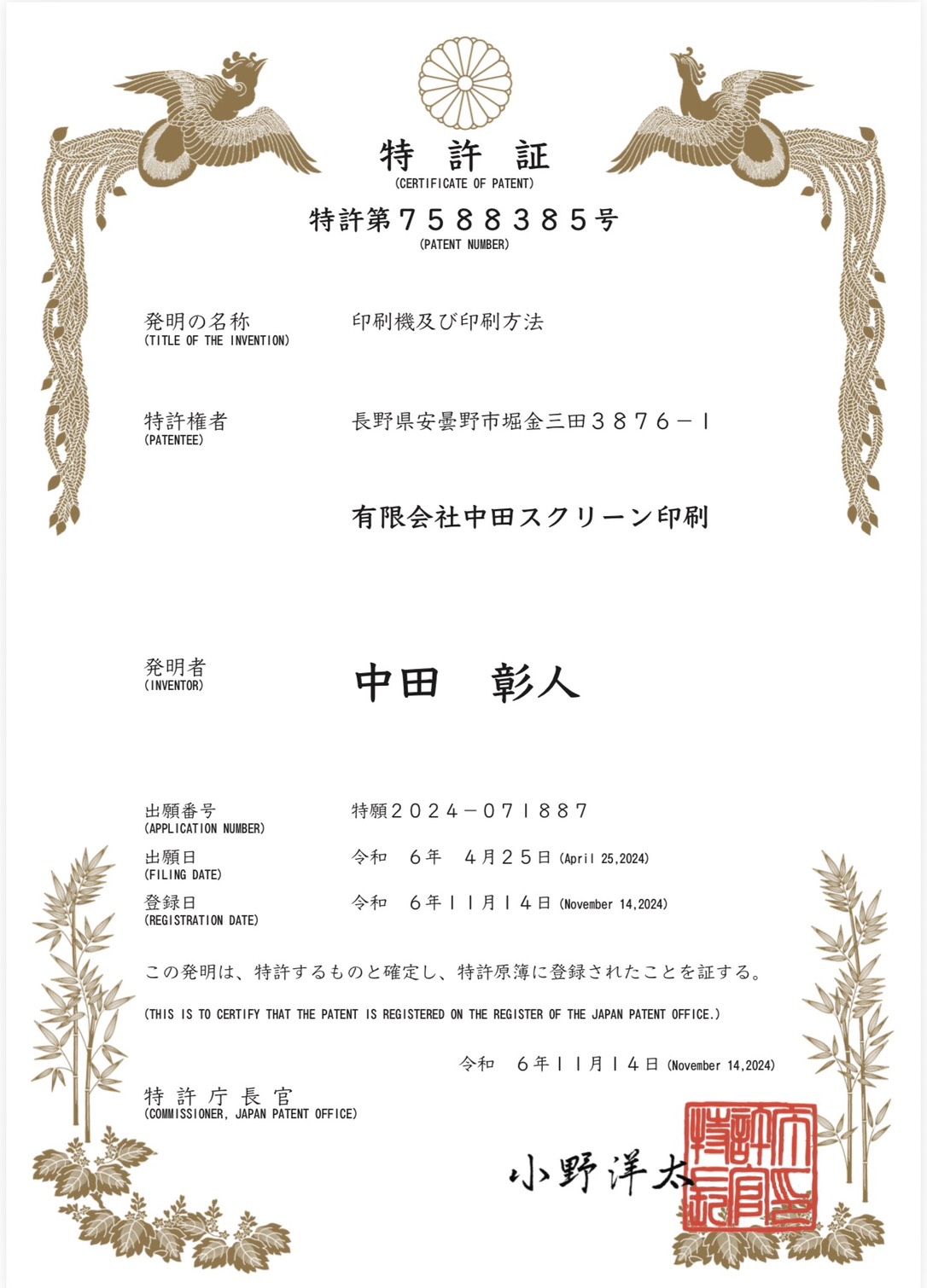 有限会社中田スクリーン印刷は、このたび当社が開発した「印刷機及び印刷方法」に関する技術について、2件の特許登録が完了したことをお知らせいたします。